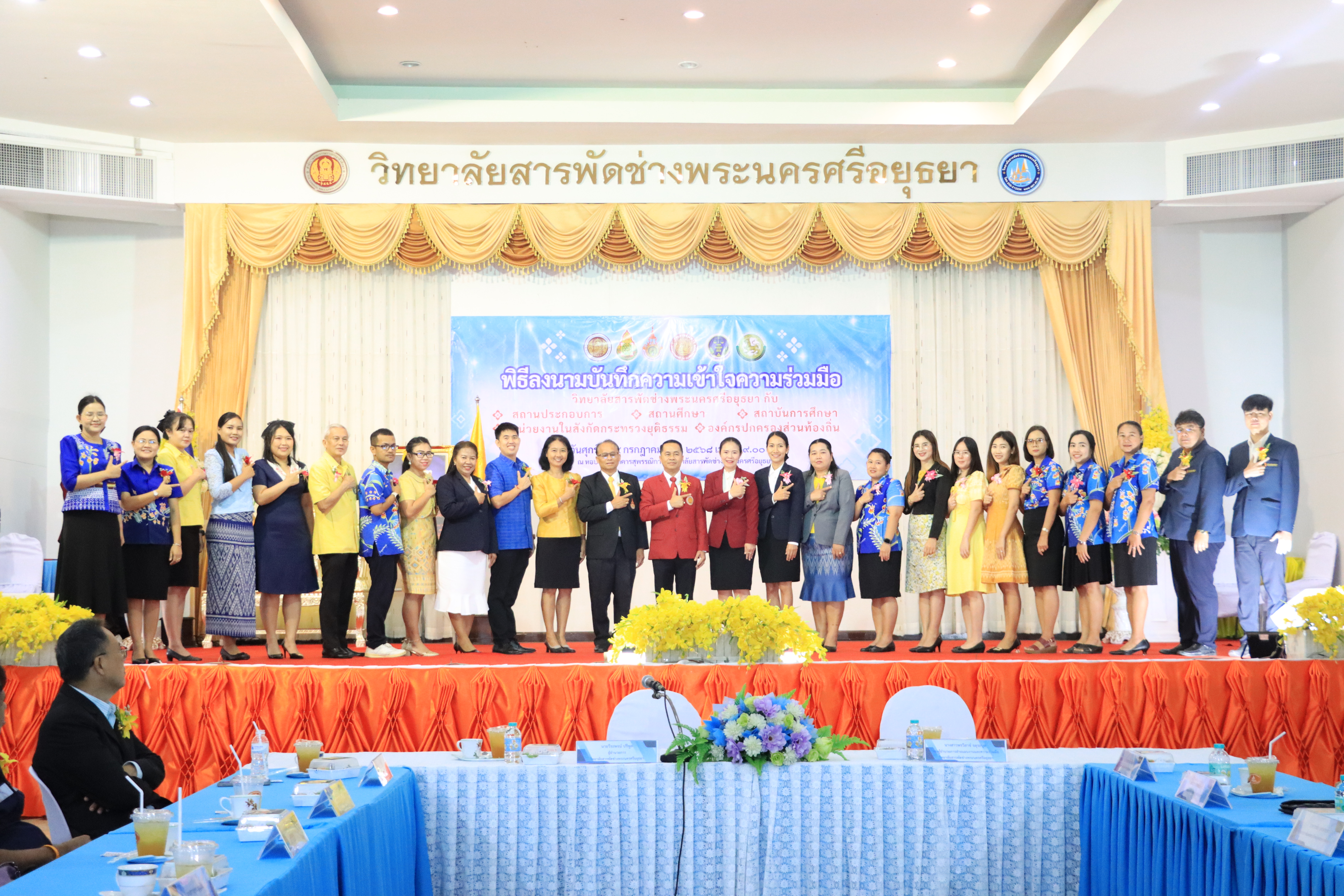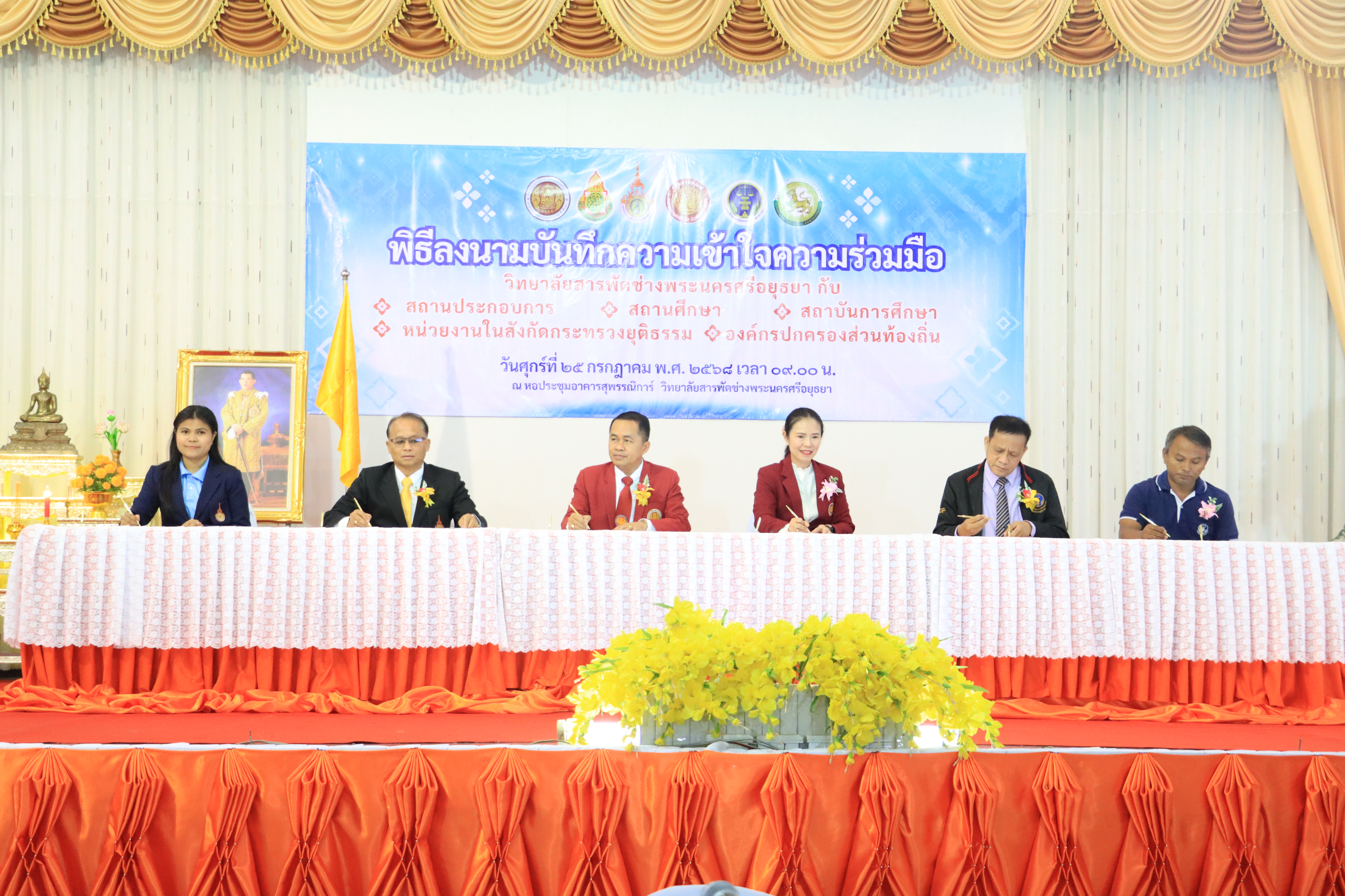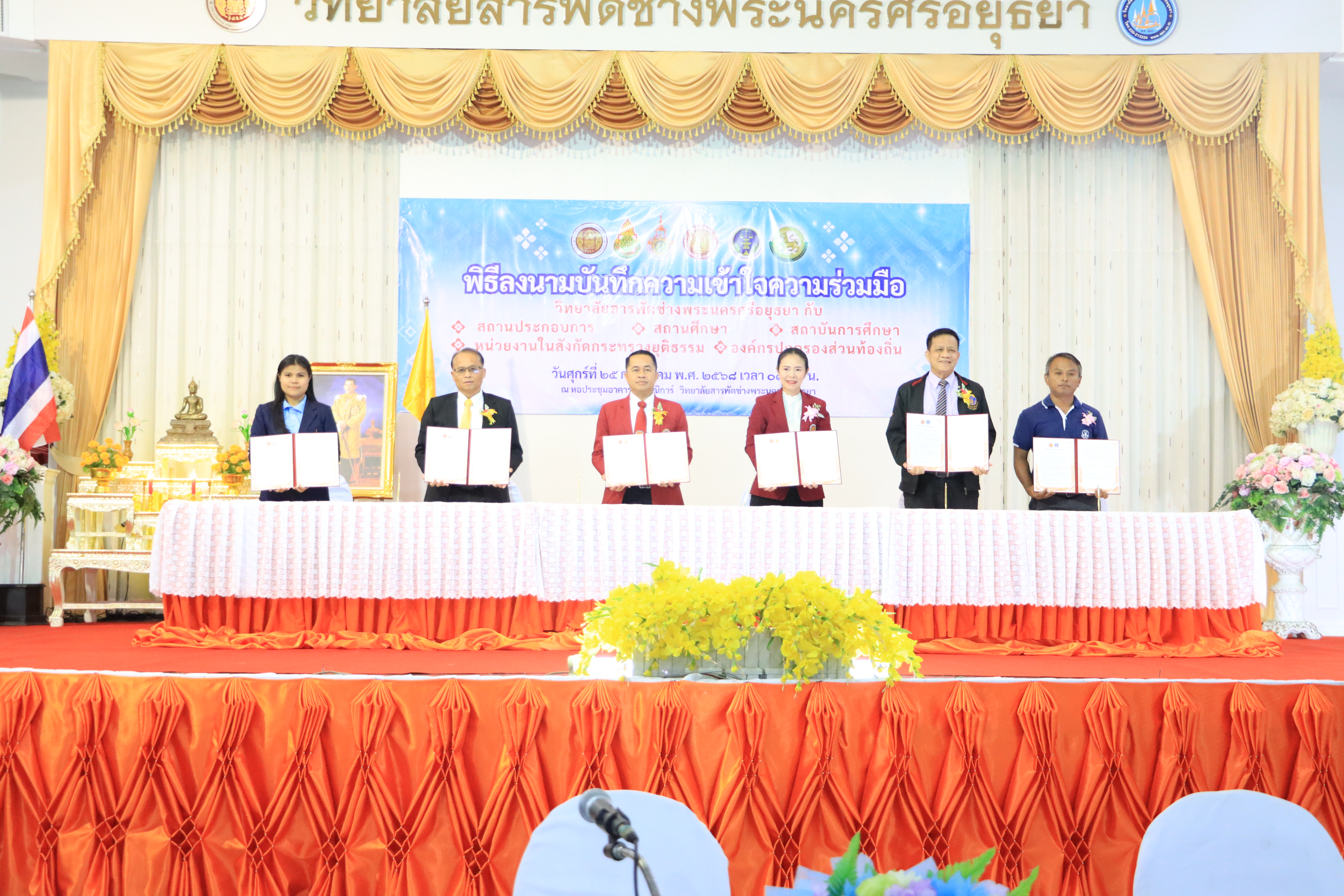 เมื่อวันศุกร์ที่ 25 กรกฎาคม 2568 รองศาสตราจารย์ ดร.ประมุข อุณหเลขกะ อธิการบดีมหาวิทยาลัยเทคโนโลยีราชมงคลสุวรรณภูมิ มอบหมายให้ ผู้ช่วยศาสตราจารย์ ดร.สุวุฒิ ตุ้มทอง ร่วมพิธีลงนามบันทึกความเข้าใจความร่วมมือกับวิทยาลัยสารพัดช่างพระนครศรีอยุธยา เพื่อส่งเสริมและพัฒนาคุณภาพการจัดการศึกษาด้านการพัฒนาหลักสูตร การฝึกประสบการณ์วิชาชีพ การสนับสนุนทรัพยากรทางการศึกษา การอบรมครูและบุคลากร ตลอดจนการจัดการศึกษาในระบบทวิภาคีอย่างมีประสิทธิภาพ และมุ่งมั่นยกระดับมาตรฐานการศึกษาให้สอดคล้องกับความต้องการของตลาดแรงงาน และสร้างโอกาสทางการศึกษาอย่างยั่งยืนให้กับเยาวชนไทย ณ หอประชุมอาคารสุพรรณิการ์ วิทยาลัยสารพัดช่างพระนครศรีอยุธยา จังหวัดพระนครศรีอยุธยา