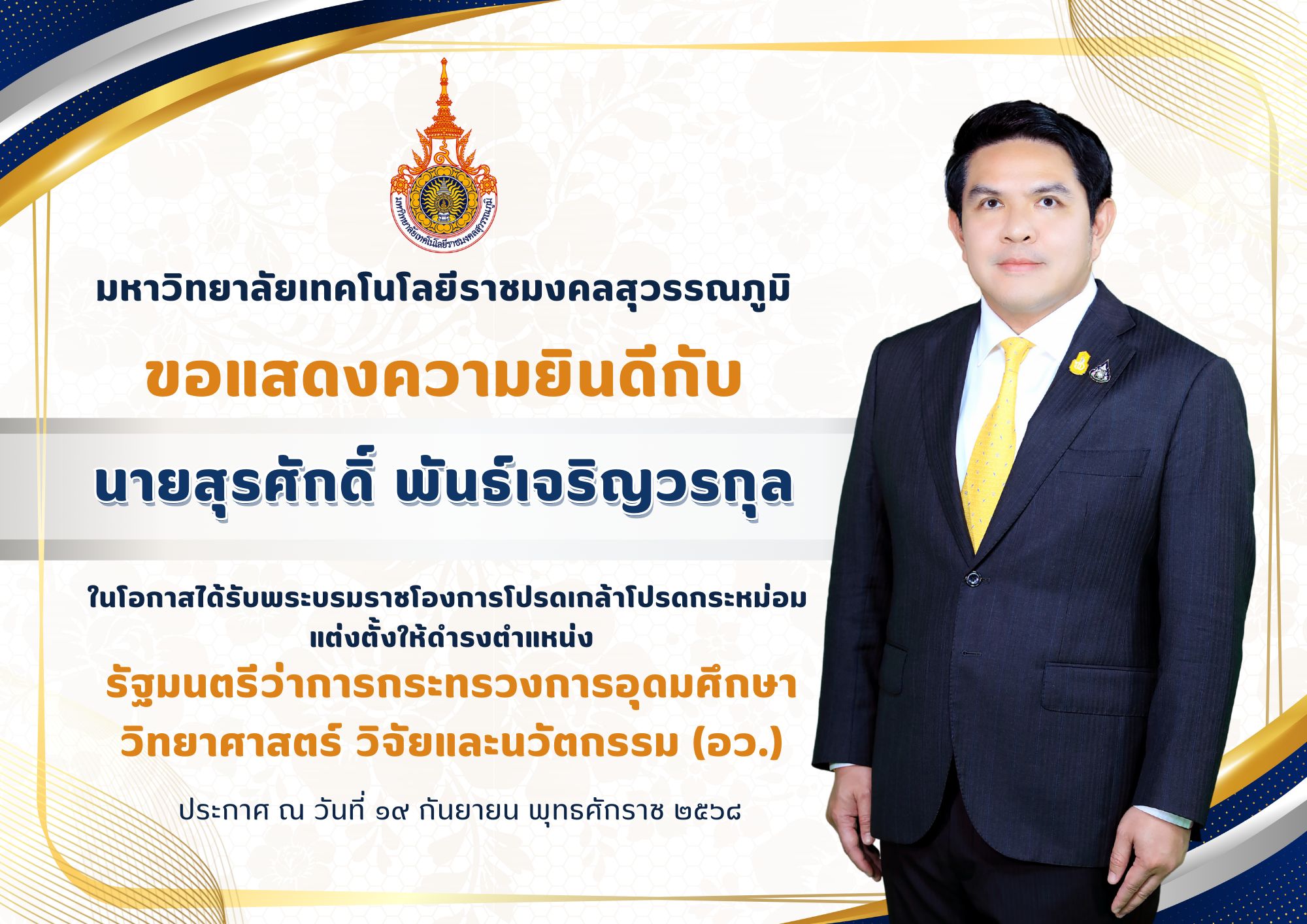 เมื่อวันพุธที่ 24 กันยายน 2568 รองศาสตราจารย์ ดร.ประมุข อุณหเลขกะ อธิการบดีมหาวิทยาลัยเทคโนโลยีราชมงคลสุวรรณภูมิ พร้อมด้วยผู้บริหาร เข้าพบเพื่อแสดงความความยินดีกับนายสุรศักดิ์ พันธ์เจริญวรกุล ในโอกาสได้รับพระบรมราชโองการโปรดเกล้าโปรดกระหม่อม แต่งตั้งให้ดำรงตำแหน่ง รัฐมนตรีว่าการกระทรวงการอุดมศึกษาวิทยาศาสตร์ วิจัยและนวัตกรรม โดยมีนางสมทรง พันธ์เจริญวรกุล นายกองค์การบริหารส่วนจังหวัดพระนครศรีอยุธยา ให้การต้อนรับ ณ จังหวัดพระนครศรีอยุธยา