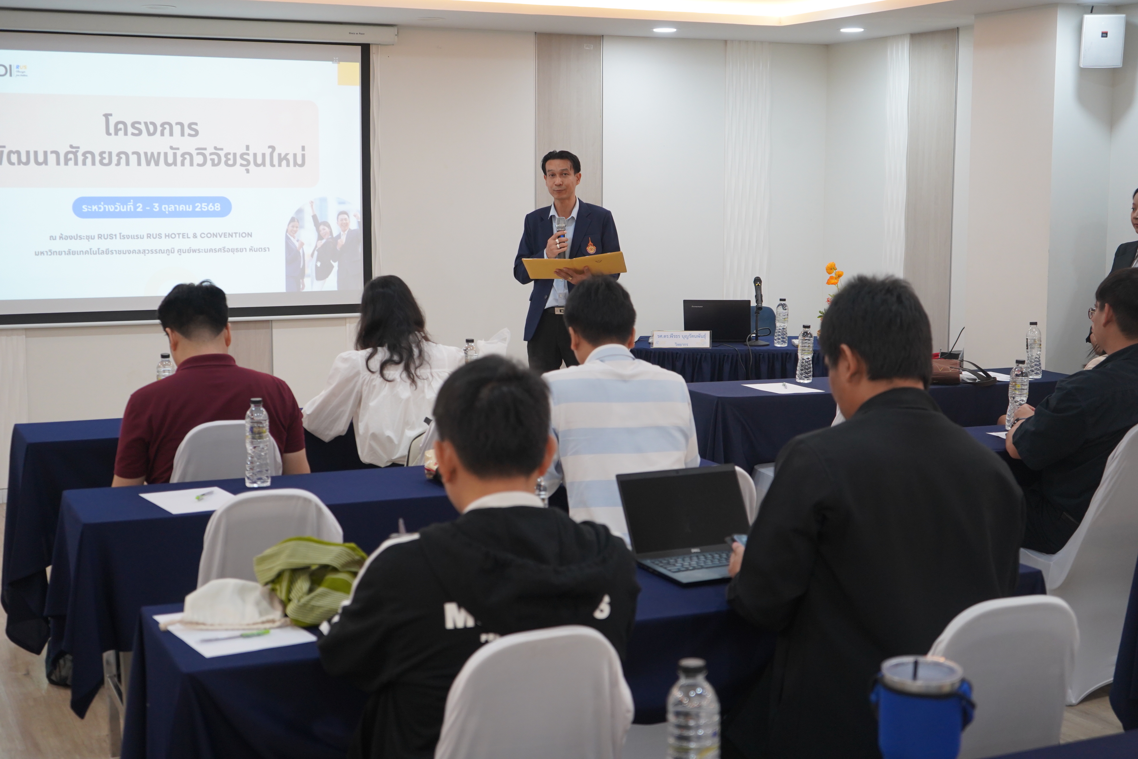 เมื่อวันที่ 2 - 3 ตุลาคม 2568 ผู้ช่วยศาสตราจารย์ ดร.สุวัฒน์ สกุลชาติ รองผู้อำนวยการสถาบันวิจัยและพัฒนา มหาวิทยาลัยเทคโนโลยีราชมงคลสุวรรณภูมิ เป็นประธานเปิดโครงการ “พัฒนาศักยภาพนักวิจัยรุ่นใหม่” เพื่อพัฒนาทักษะด้านการวิจัยให้แก่นักวิจัยรุ่นใหม่ของมหาวิทยาลัย สนับสนุนให้นักวิจัยรุ่นใหม่สามารถจัดทำข้อเสนอโครงการวิจัยได้อย่างมีประสิทธิภาพ และกระตุ้นให้มีการผลิตผลงานวิจัยที่สามารถนำไปใช้ประโยชน์ได้จริง โดยได้รับเกียรติจากรองศาสตราจารย์ ดร.พีรธร บุณยรัตพันธุ์ จากภาควิชารัฐศาสตร์และรัฐประศาสนศาสตร์ คณะสังคมศาสตร์ มหาวิทยาลัยนเรศวร เป็นวิทยากรบรรยายและฝึกปฏิบัติ มีนักวิจัยรุ่นใหม่จากทั้ง 6 คณะ เข้าร่วมอบรมจำนวน 29 ท่าน จัดโดยงานบริหารงานวิจัย สถาบันวิจัยและพัฒนา ณ ห้องประชุม RUS 1 โรงแรม RUS Hotel & Convention มหาวิทยาลัยเทคโนโลยีราชมงคลสุวรรณภูมิ ศูนย์พระนครศรีอยุธยา หันตรา