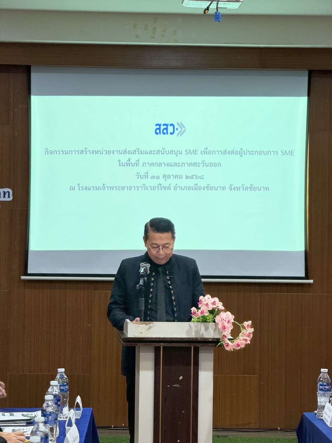 เมื่อวันศุกร์ที่ 31 ตุลาคม 2568 งานบริการวิชาการและถ่ายทอดเทคโนโลยี สถาบันวิจัยและพัฒนา มหาวิทยาลัยเทคโนโลยีราชมงคลสุวรรณภูมิ นำโดย นางสาวพนิดา เฟื่องขจร หัวหน้างานบริการวิชาการและถ่ายทอดเทคโนโลยี พร้อมด้วยทีมงานเข้าร่วมกิจกรรม “การสร้างหน่วยงานส่งเสริมและสนับสนุน SME เพื่อการส่งต่อผู้ประกอบการในพื้นที่”ณ โรงแรมเจ้าพระยาธาราริเวอร์ไซต์ อำเภอเมืองชัยนาท จังหวัดชัยนาท โดยมี นายวิษณุ วิทยวราวัฒน์ รองผู้ว่าราชการจังหวัดชัยนาท เป็นประธานเปิดงาน พร้อมด้วยหน่วยงานภาครัฐและเอกชนในจังหวัดชัยนาทกว่า 20 หน่วยงาน ร่วมบูรณาการความร่วมมือเพื่อ ส่งเสริม พัฒนา และสนับสนุนผู้ประกอบการ SME ให้เข้าถึงบริการและสิทธิประโยชน์ของภาครัฐอย่างทั่วถึง มุ่งสร้างระบบนิเวศธุรกิจที่เข้มแข็งและยั่งยืนในพื้นที่จังหวัดชัยนาท