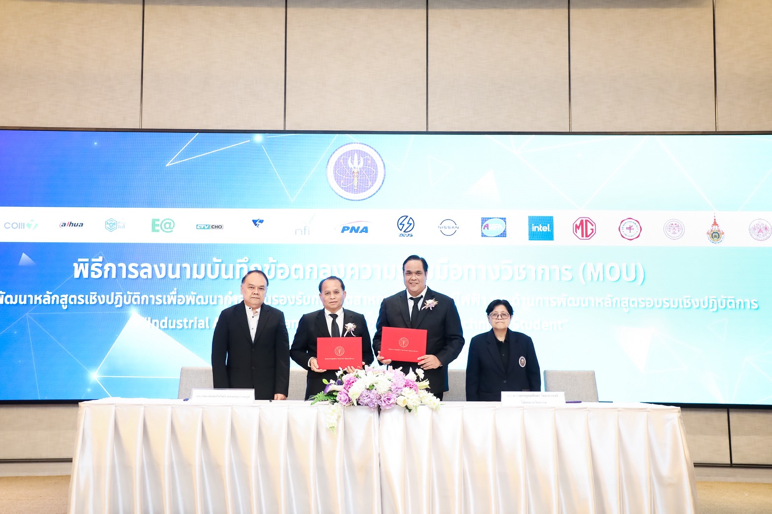 เมื่อวันพฤหัสบดีที่ 29 มกราคม 2569 รองศาสตราจารย์ ดร.ประมุข อุณหเลขกะ อธิการบดีมหาวิทยาลัยเทคโนโลยีราชมงคลสุวรรณภูมิ มอบหมายให้ผู้ช่วยศาสตราจารย์ ดร.สุวุฒิ ตุ้มทอง รองอธิการบดี พร้อมด้วย ผู้ช่วยศาสตราจารย์ทวีศักดิ์ ศรีจันทร์อินทร์ ผู้ช่วยศาสตราจารย์เกษม เจนวิไลศิลป์ และอาจารย์กุศล สมุทรคชรินทร์ คณะวิศวกรรมศาสตร์และสถาปัตยกรรมศาสตร์ ร่วมพิธีลงนามบันทึกข้อตกลงความร่วมมือทางวิชาการ (MOU) ว่าด้วยการพัฒนาหลักสูตรอบรมเชิงปฏิบัติการ “Industrial AI Literacy and Application for Non–Technical Student” และการพัฒนาหลักสูตรเชิงปฏิบัติการเพื่อพัฒนากำลังคนรองรับอุตสาหกรรมยานยนต์ไฟฟ้า โดยมีดร.พันธุ์เพิ่มศักดิ์ อารุณี รองปลัดกระทรวงการอุดมศึกษา วิทยาศาสตร์ วิจัยและนวัตกรรม (อว.) เป็นประธานในพิธีลงนาม เพื่อยกระดับขีดความสามารถในการแข่งขันของประเทศ โดยให้ความสำคัญกับการพัฒนาทรัพยากรมนุษย์ให้มีสมรรถนะและทักษะที่จำเป็นต่อโลกการทำงานในอนาคต ความร่วมมือในครั้งนี้สะท้อนนโยบายการส่งเสริมความร่วมมือเชิงบูรณาการระหว่างภาครัฐ ภาคเอกชน และสถาบันอุดมศึกษา เพื่อพัฒนากำลังคนอย่างเป็นรูปธรรม ครอบคลุม 2 ด้านสำคัญ ได้แก่ การพัฒนาหลักสูตร “Industrial AI Literacy and Application for Non–Technical Student” เพื่อขยายทักษะด้านดิจิทัลและปัญญาประดิษฐ์อย่างทั่วถึง และการพัฒนาหลักสูตรเชิงปฏิบัติการเพื่อรองรับอุตสาหกรรมยานยนต์ไฟฟ้า ซึ่งเป็นหนึ่งในอุตสาหกรรมเป้าหมายของประเทศ ณ ห้องกมลทิพย์ 3 ชั้น 2 โรงแรมสุโกศล กรุงเทพมหานคร