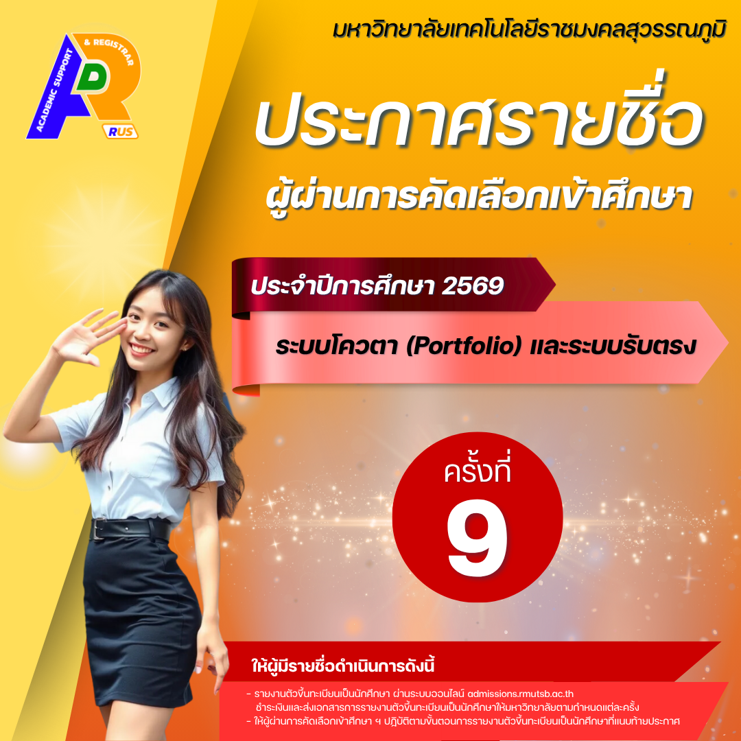 ประกาศรายชื่อผู้ผ่านการคัดเลือกเข้าศึกษา ประจำปีการศึกษา 2569 ระบบโควตา (Portfolio) และระบบรับตรง ครั้งที่ 9 | ครั้ง เมื่อ 1 ชั่วโมงที่แล้ว
