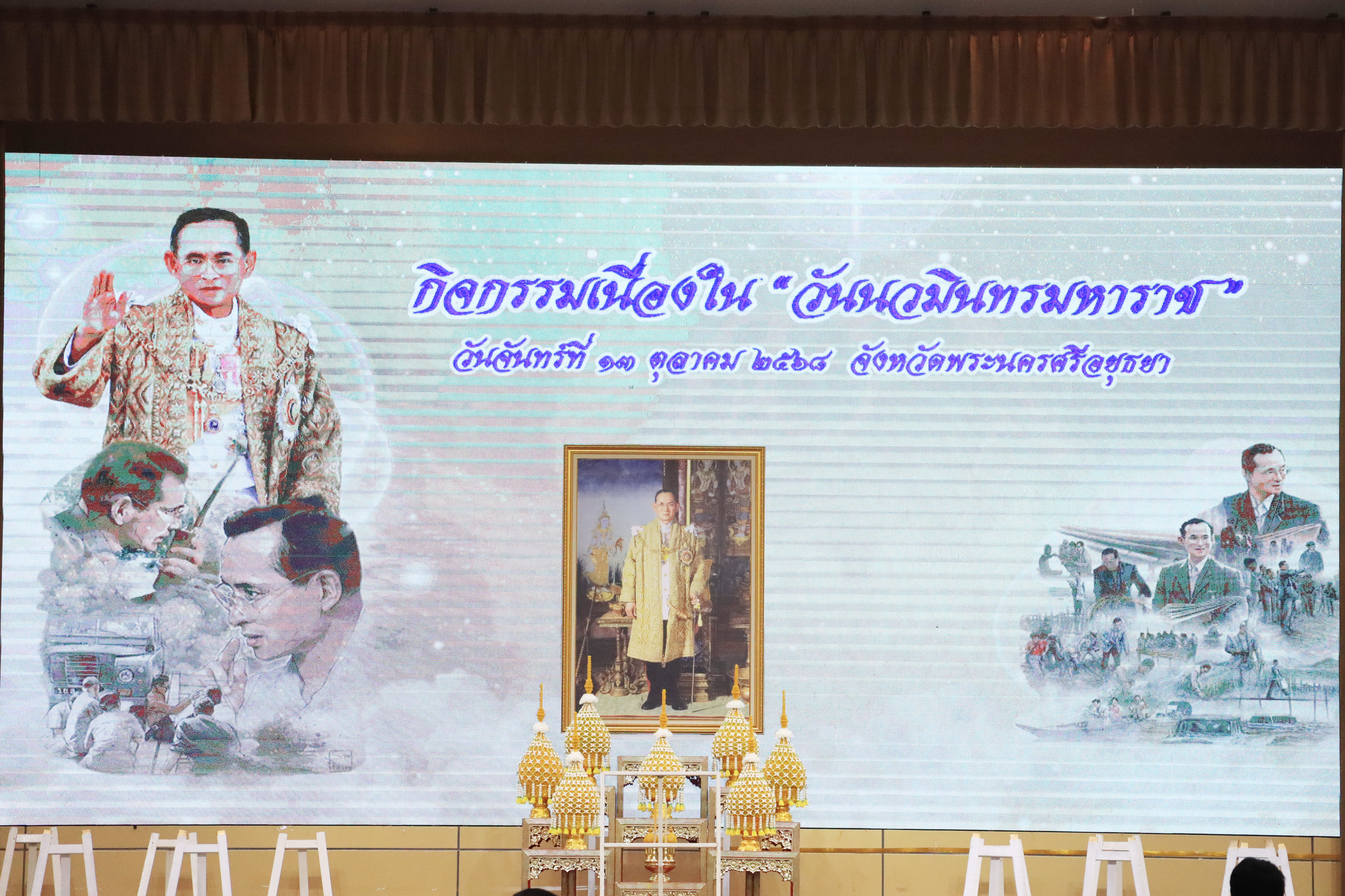 เมื่อวันจันทร์ที่ 13 ตุลาคม 2568 รองศาสตราจารย์ ดร.ประมุข อุณหเลขกะ อธิการบดีมหาวิทยาลัยเทคโนโลยีราชมงคลสุวรรณภูมิ มอบหมายให้นายภูริทัต อยู่สบาย ผู้อำนวยการกองกลาง มหาวิทยาลัยเทคโนโลยีราชมงคลสุวรรณภูมิ พร้อมด้วยบุคลากร ร่วมกิจกรรมเนื่องในวันนวมินทรมหาราช 13 ตุลาคม 2568 วางพวงมาลาเบื้องหน้าพระบรมฉายาลักษณ์พระบาทสมเด็จพระบรมชนกาธิเบศร มหาภูมิพลอดุลยเดชมหาราช บรมนาถบพิตร (ในหลวง รัชกาลที่ 9) โดยมีนายประพันธ์ ตรีบุบผา รองผู้ว่าราชการจังหวัดพระนครศรีอยุธยา เป็นประธานในพิธี เพื่อเป็นการน้อมรำลึกถึงพระมหากรุณาธิคุณในพระบาทสมเด็จพระบรมชนกาธิเบศร มหาภูมิพลอดุลยเดชมหาราช บรมนาถบพิตร ที่ทรงมีต่อปวงชนชาวไทยเป็นล้นพ้นอย่างหาที่สุดมิได้ ทั้งนี้ รองศาสตราจารย์ ดร.ทรงวิทย์ เจริญกิจธนลาภ อาจารย์ประจำคณะบริหารธุรกิจและเทคโนโลยีสารสนเทศได้รับเกียรติเป็นพิธีกรในครั้งนี้ จัดโดยจังหวัดพระนครศรีอยุธยา ณ หอประชุมพระพิรุณ – ระลึกโปรดเกล้าฯ มหาวิทยาลัยทคโนโลยีราชมงคลสุวรรณภูมิ ศูนย์พระนครศรีอยุธยา หันตรา