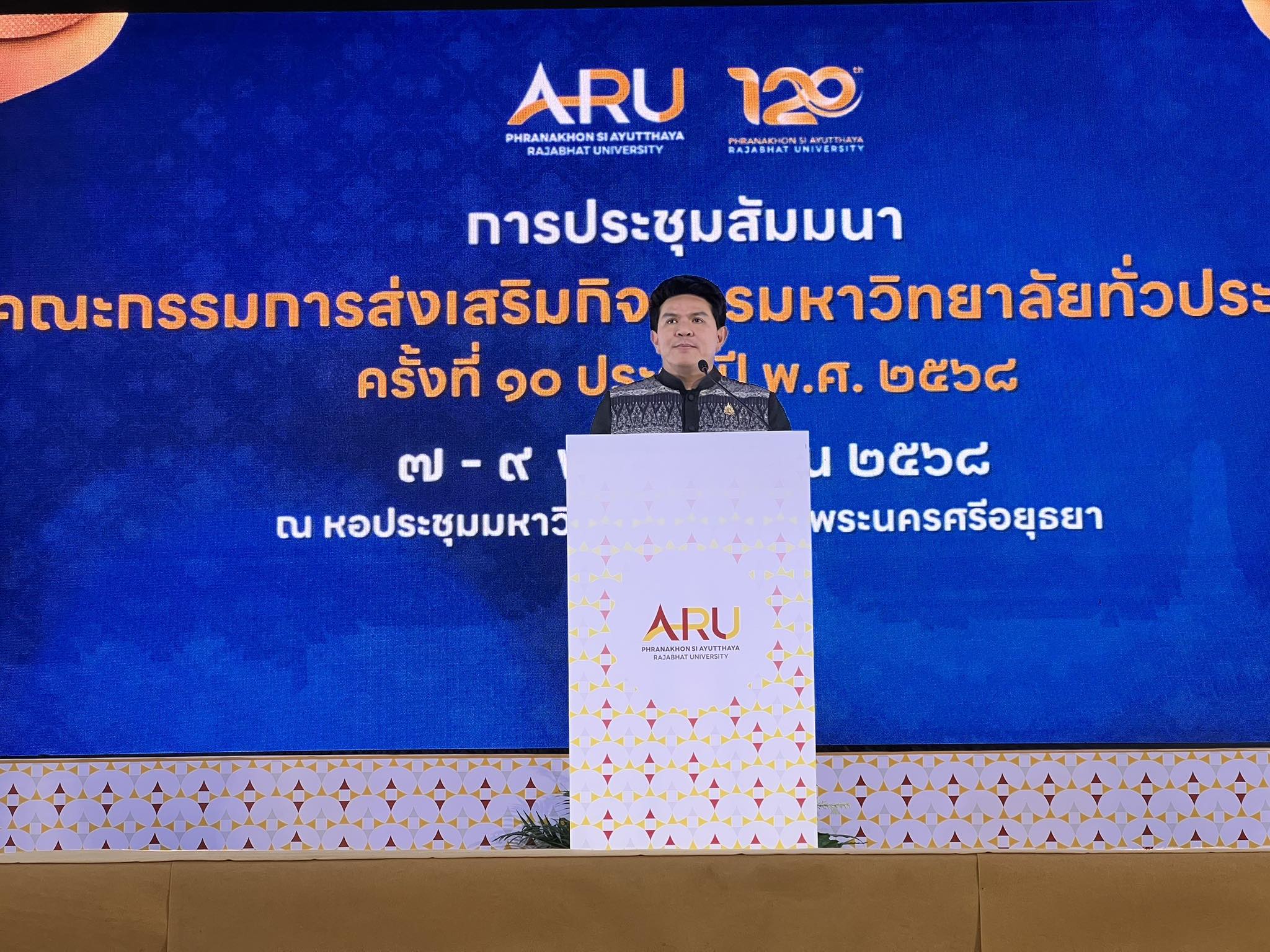 เมื่อวันศุกร์ที่ 7 พฤศจิกายน 2568 รองศาสตราจารย์ ดร.ประมุข อุณหเลขกะ อธิการบดีมหาวิทยาลัยเทคโนโลยีราชมงคลสุวรรณภูมิ มอบหมายให้ ผู้ช่วยศาสตราจารย์สัญญา คำจริง รองอธิการบดีเข้าร่วมการประชุมสัมมนาคณะกรรมการส่งเสริมกิจการมหาวิทยาลัยทั่วประเทศ ครั้งที่ 10 “Soft Power รักษ์ไทย รักษ์ธรรม เลิศล้ำมรดกโลก” ซึ่งมหาวิทยาลัยราชภัฏพระนครศรีอยุธยาเป็นเจ้าภาพการประชุมสัมมนาในครั้งนี้ โดยมีนายสุรศักดิ์ พันธ์เจริญวรกุล รัฐมนตรีว่าการกระทรวงการอุดมศึกษา วิทยาศาสตร์ วิจัย และนวัตกรรม เป็นประธานเปิดการประชุมสัมมนา เพื่อขับเคลื่อนความร่วมมือในการพัฒนามหาวิทยาลัยเครือข่ายทั่วประเทศ เป็นเวทีพบปะ แลกเปลี่ยนแนวคิดและประสบการณ์ของคณะกรรมการส่งเสริมกิจการมหาวิทยาลัย ให้ผู้เข้าร่วมประชุมสัมมนาได้รับความรู้และประสบการณ์จากการบรรยายและการศึกษาดูงาน สร้างเครือข่าย คสม.ทั่วประเทศ และร่วมเฉลิมฉลองครบรอบ 120 ปี แห่งการสถาปนามหาวิทยาลัยราชภัฏพระนครศรีอยุธยา ณ มหาวิทยาลัยราชภัฏพระนครศรีอยุธยา