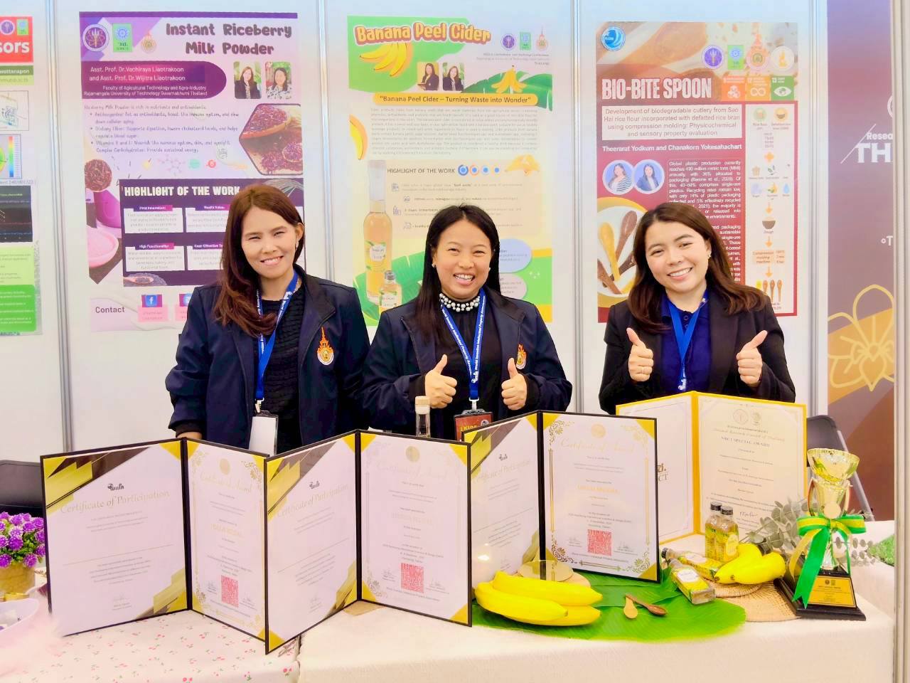 - ไซเดอร์เปลือกกล้วย – รางวัลเหรียญเงิน และ NRCT Honorable Mention Award ผลงานโดย ผู้ช่วยศาตราจารย์ ดร.วิจิตรา เหลียวตระกูล คณะเทคโนโลยีการเกษตรและอุตสาหกรรมเกษตรนวัตกรรมเครื่องดื่มเพื่อสุขภาพที่พัฒนาจากเปลือกกล้วย เพิ่มมูลค่าวัสดุเหลือทิ้งทางการเกษตรตามแนวคิด Zero Waste เปลี่ยนของเหลือใช้ให้เป็นผลิตภัณฑ์ที่มีคุณค่าทางโภชนาการและเป็นมิตรต่อสิ่งแวดล้อม