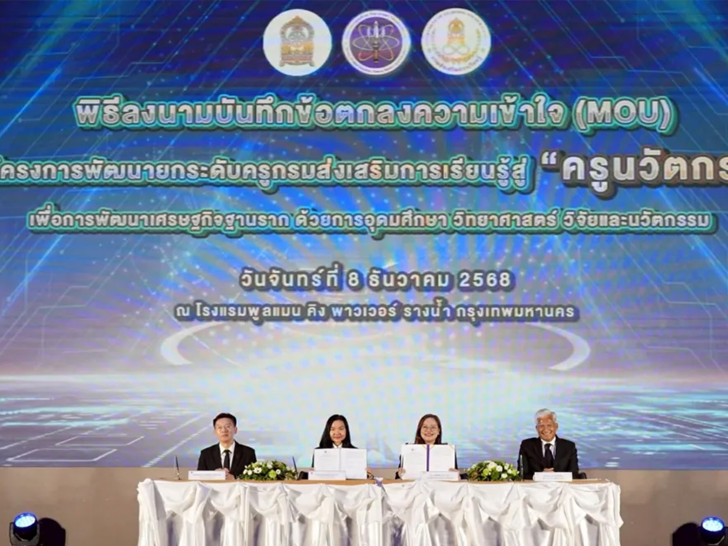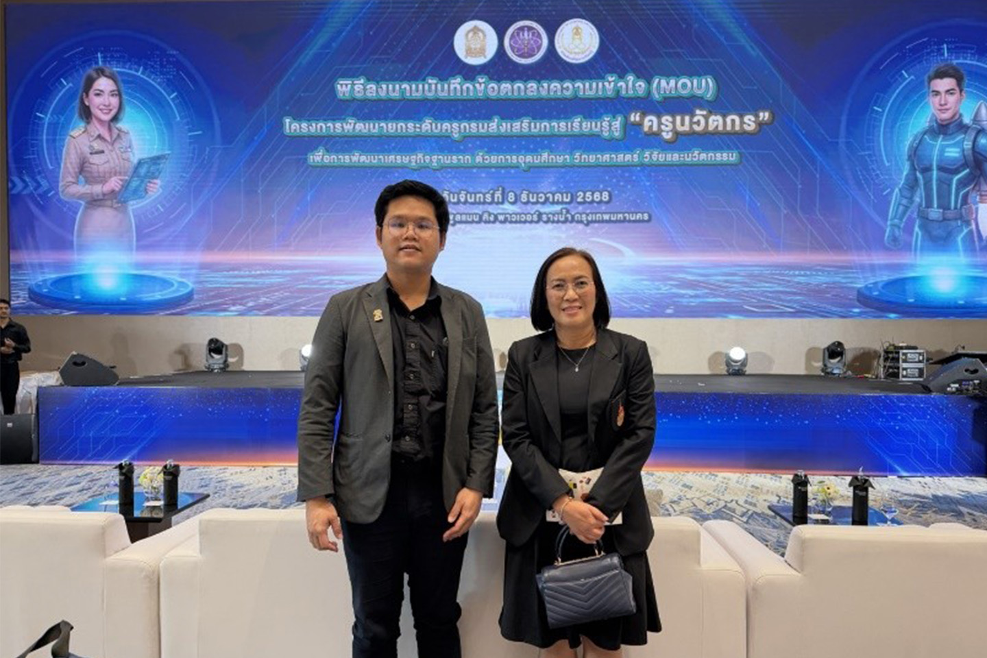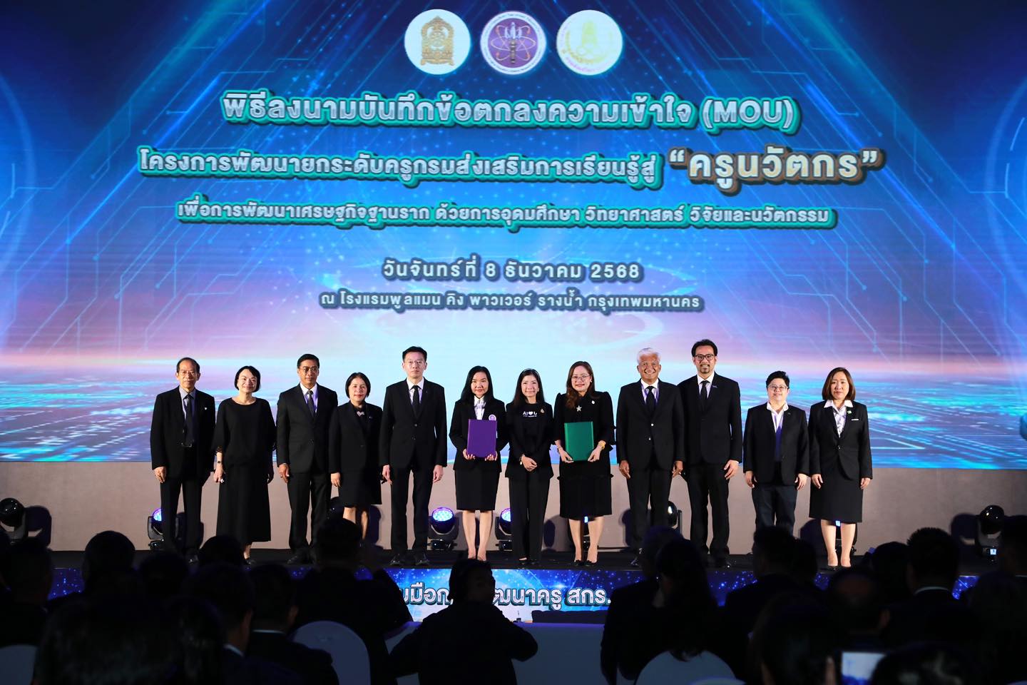 เมื่อวันจันทร์ที่ 8 ธันวาคม 2568 รองศาสตราจารย์ ดร.ประมุข อุณหเลขกะ อธิการบดีมหาวิทยาลัยเทคโนโลยีราชมงคลสุวรรณภูมิ มอบหมายให้ ผู้ช่วยศาสตราจารย์ ดร.วารุณี ศรีสงคราม ผู้อำนวยการสถาบันวิจัยและพัฒนา และ อาจารย์ ดร. ศิวัตม์ พลอินทร์ รองผู้อำนวยการสถาบันวิจัยและพัฒนา เข้าร่วมในพิธีลงนามบันทึกข้อตกลงความร่วมมือ (MOU) “โครงการพัฒนายกระดับครูกรมส่งเสริมการเรียนรู้ สู่ครูนวัตกร เพื่อการพัฒนาเศรษฐกิจฐานราก ด้วยการอุดมศึกษา วิทยาศาสตร์ วิจัยและนวัตกรรม (อววน.)” ระหว่างสำนักงานปลัดกระทรวงการอุดมศึกษา วิทยาศาสตร์ วิจัยและนวัตกรรม (อว.) และ กรมส่งเสริมการเรียนรู้ (สกร.) โดยมี ดร.สุเทพ แก่งสันเทียะ ปลัดกระทรวงศึกษาธิการ นางสาววราภรณ์ รุ่งตระการ รองปลัดกระทรวงการอุดมศึกษา วิทยาศาสตร์ วิจัยและนวัตกรรม ดร.เกศทิพย์ ศุภวานิช อธิบดีกรมส่งเสริมการเรียนรู้ พร้อมด้วยผู้บริหารระดับสูง คณะครูอาจารย์ และภาคีเครือข่าย เข้าร่วมงาน เพื่อขับเคลื่อนองค์ความรู้ด้านการอุดมศึกษา วิทยาศาสตร์ วิจัยและนวัตกรรม ไปสู่การสร้างประโยชน์ในเชิงพื้นที่อย่างเป็นระบบ พร้อมวางรากฐานการเรียนรู้ตลอดชีวิตแก่ประชาชนทุกกลุ่มวัย เพื่อสนับสนุนการเติบโตของเศรษฐกิจฐานรากอย่างยั่งยืน การศึกษาคือรากฐาน สร้างคนพร้อมรับโลกอนาคต ณ โรงแรมพูลแมน คิงเพาเวอร์ รางน้ำ กรุงเทพฯ