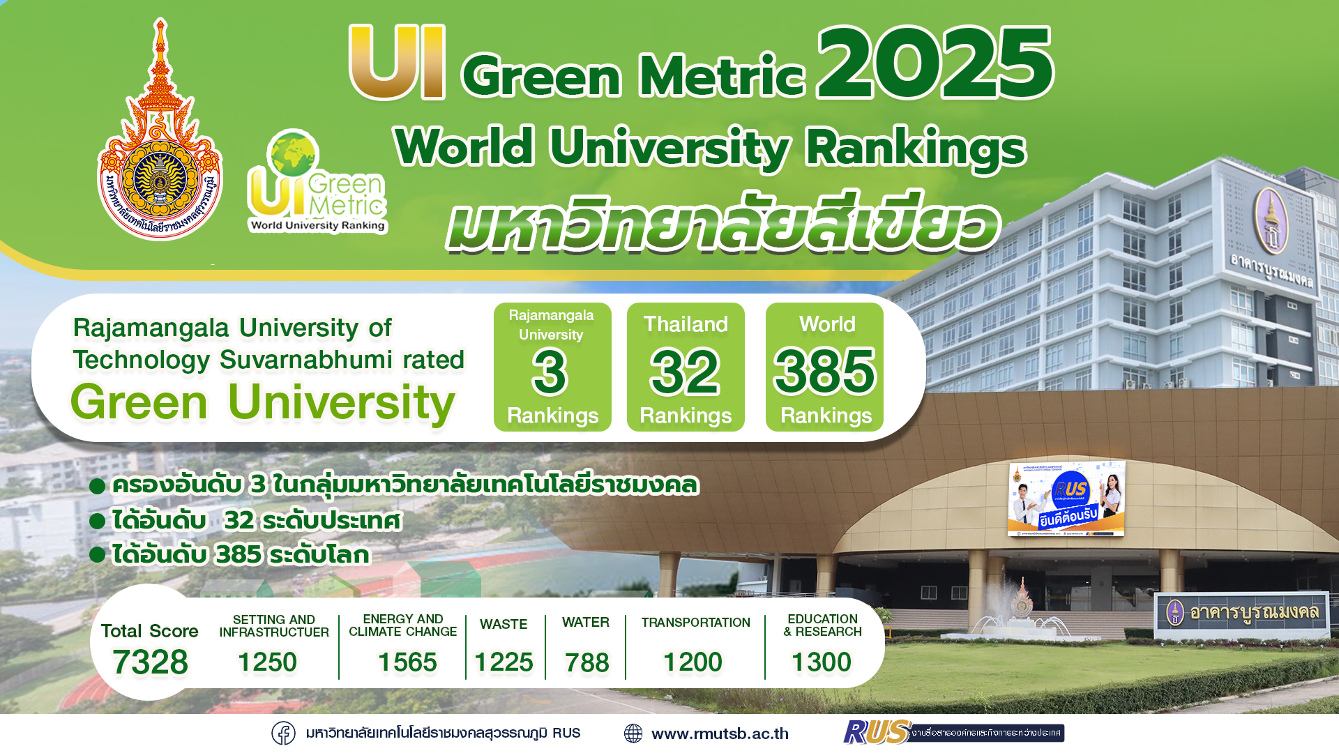 พร้อมทำคะแนนรวม 7,328 คะแนน ซึ่งสะท้อนถึงความก้าวหน้าและความตั้งใจจริงในการพัฒนาอย่างยั่งยืน การประเมิน UI GreenMetric พิจารณาจาก 6 ด้านหลัก ได้แก่