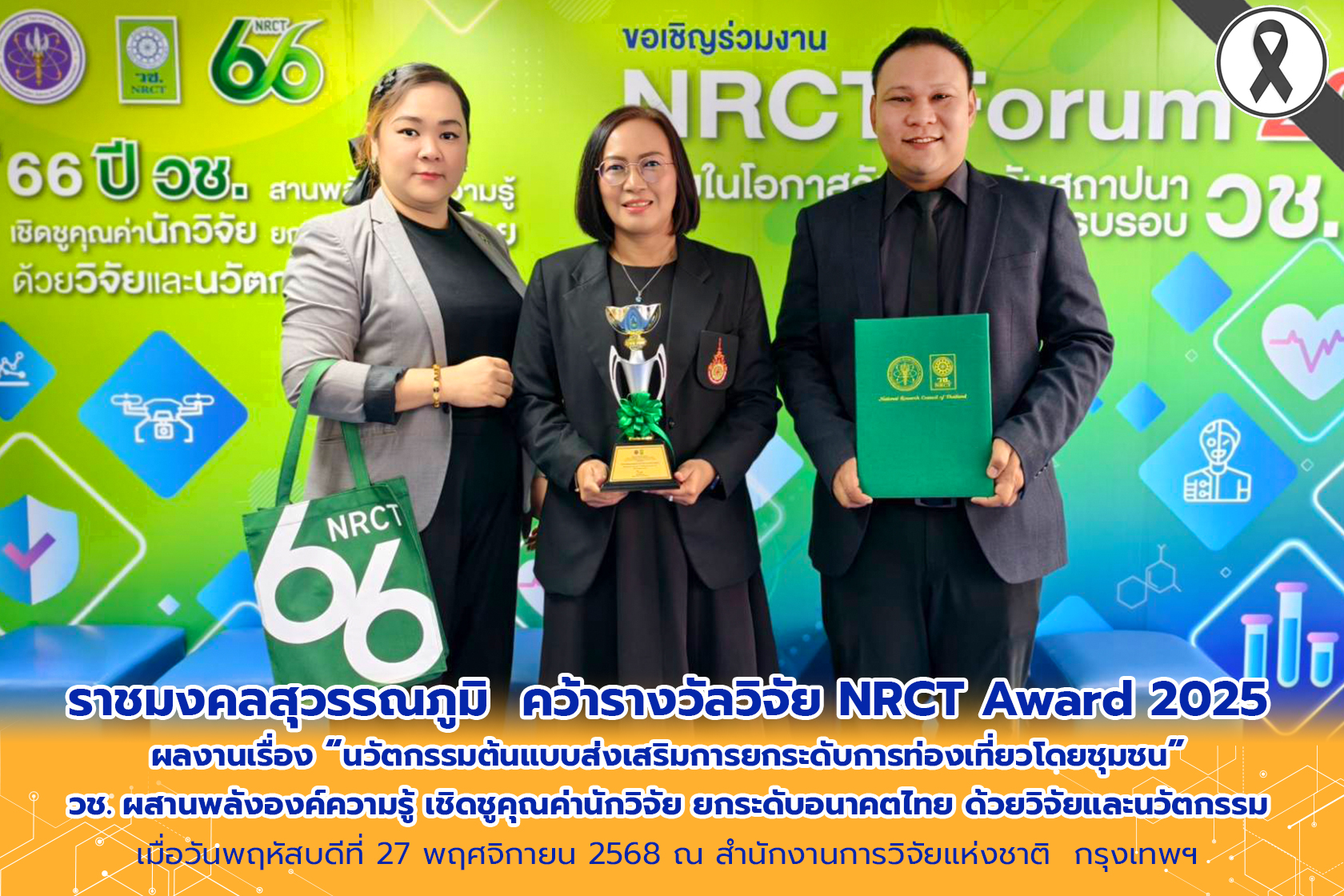 ราชมงคลสุวรรณภูมิ คว้ารางวัลวิจัย NRCT Award 2025 ผลงานเรื่อง “นวัตกรรมต้นแบบส่งเสริมการยกระดับการท่องเที่ยวโดยชุมชน “วช. ผสานพลังองค์ความรู้ เชิดชูคุณค่านักวิจัย ยกระดับอนาคตไทย ด้วยวิจัยและนวัตกรรม” | ครั้ง เมื่อ 57 นาทีที่แล้ว