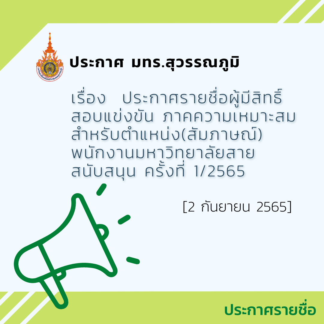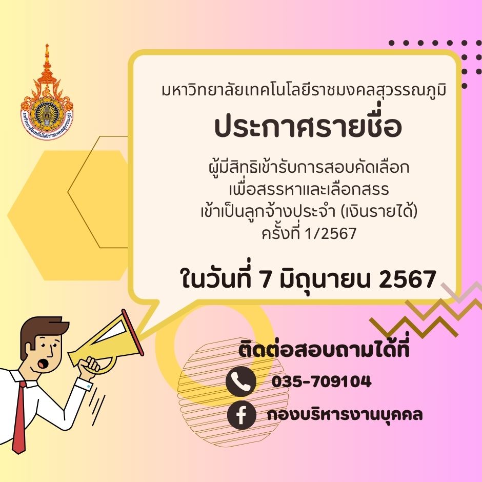 ประกาศ มทร.สุวรรณภูมิ เรื่อง ผลการคัดเลือกผู้บริหารจัดการพื้นที่สำหรับให้ร้านค้าจำหน่ายสินค้าในงานพิธีพระราชทานปริญญาบัตร 2567 | ครั้ง