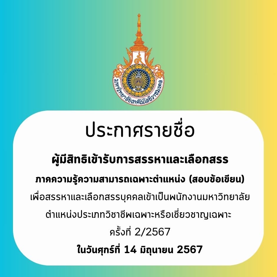 ประกาศ มทร.ส. เรื่อง ประกาศผลการคัดเลือก ผู้ให้บริการถ่ายภาพพิธีพระราชทานปริญญาบัตร พร้อมถ่ายภาพหมู่บัณฑิต ในวันฝึกซ้อมใหญ่พิธีพระราชทานปริญญาบัตร มหาวิทยาลัยเทคโนโลยีราชมงคลสุวรรณภูมิ ประจำปีการศึกษา 2567 | ครั้ง