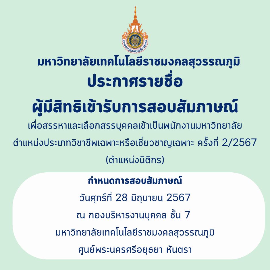 ประกาศ มทร.สุวรรณภูมิ เรื่อง ประกาศผลผู้มีสิทธิสัมภาษณ์ และเปลี่ยนแปลงกำหนดวัน เวลา และสถานที่สัมภาษณ์ เพื่อคัดเลือกผู้ให้บริการถ่ายภาพพิธีพระราชทานปริญญาบัตรฯ ปีการศึกษา 2567 | ครั้ง